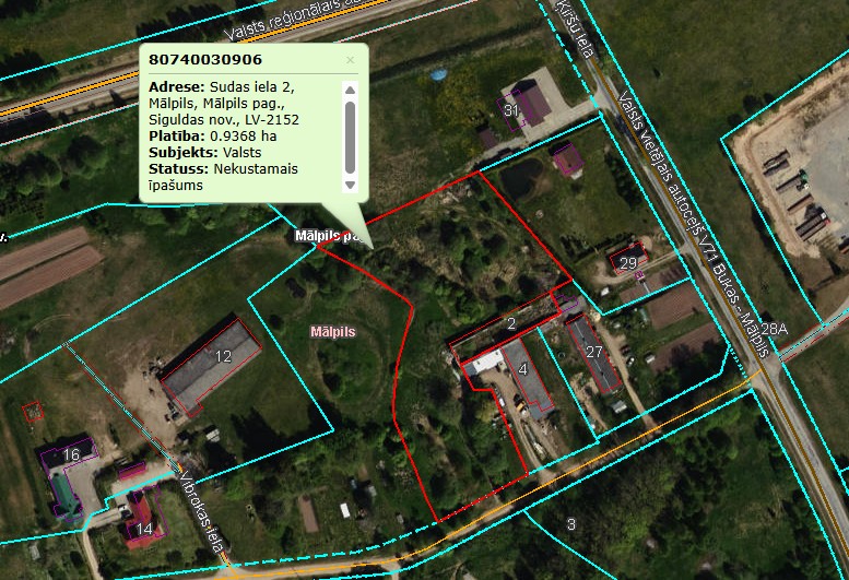 Sudas ielā 2, Mālpilī, Mālpils pagastā, Siguldas novadā (kadastra numurs 8074 003 0907), kas sastāv no zemes vienības 0,9368 ha platībā (zemes vienības kadastra apzīmējums 8074 003 0906) un būves (būves kadastra apzīmējums 8074 003 0280 003). Izsoles sākumcena EUR 17600. Izsoles solis - EUR 100.